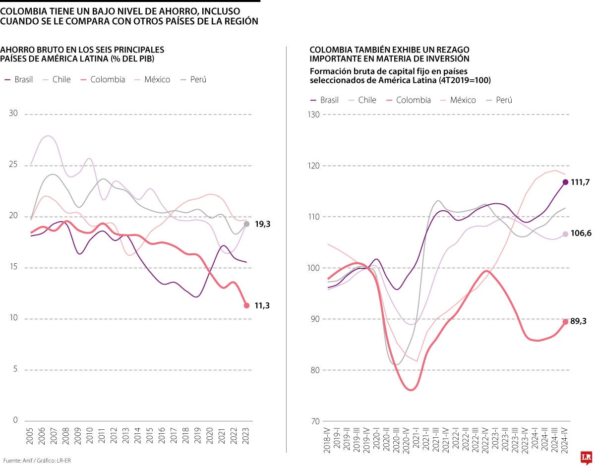 Desde Anif se expuso que, de manera tendencial, la nación viene reduciendo su nivel de ahorro, respaldado con cifras de ahorro bruto a comparación con otros países de América Latina. Colombia tuvo el ahorro más bajo con 11,3%, lo que lo posiciona por debajo de países como Brasil, México, Perú y Chile. Por otro lado, si la comparación se hace con países asiáticos, Anif afirma que la brecha se vuelve mucho mayor.