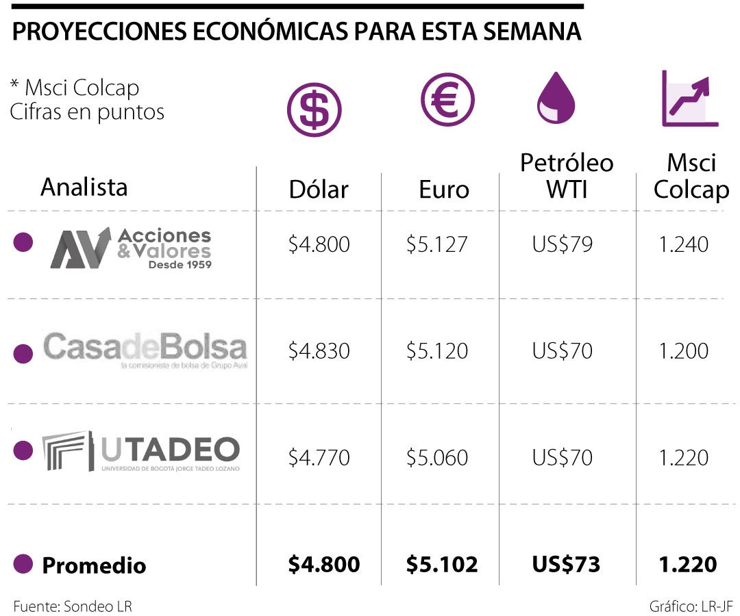 Por otro lado, los analistas proyectan que el índice bursátil Msci Colcap, que mide el comportamiento de las acciones más líquidas de la Bolsa de Valores de Colombia (BVC), se cotizará cercano a los 1.220 puntos, mientras que el euro rondaría los $5.120.