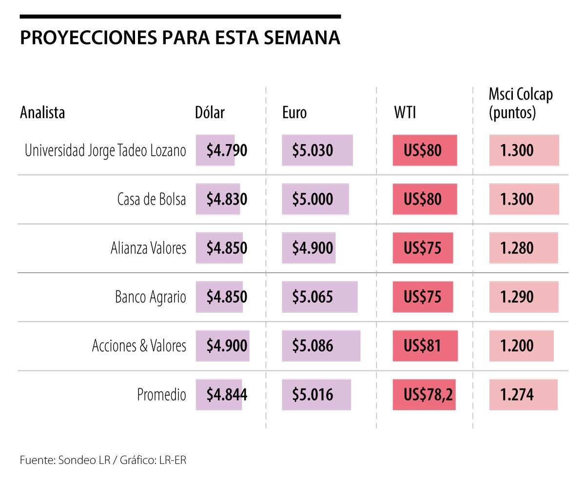 Por otro lado, los analistas proyectan que el Msci Colcap, que mide el comportamiento de las acciones más líquidas de la Bolsa de Valores de Colombia (BVC), cotizará cercano a los 1.274 puntos. Mientras el euro rondaría los $5.016.