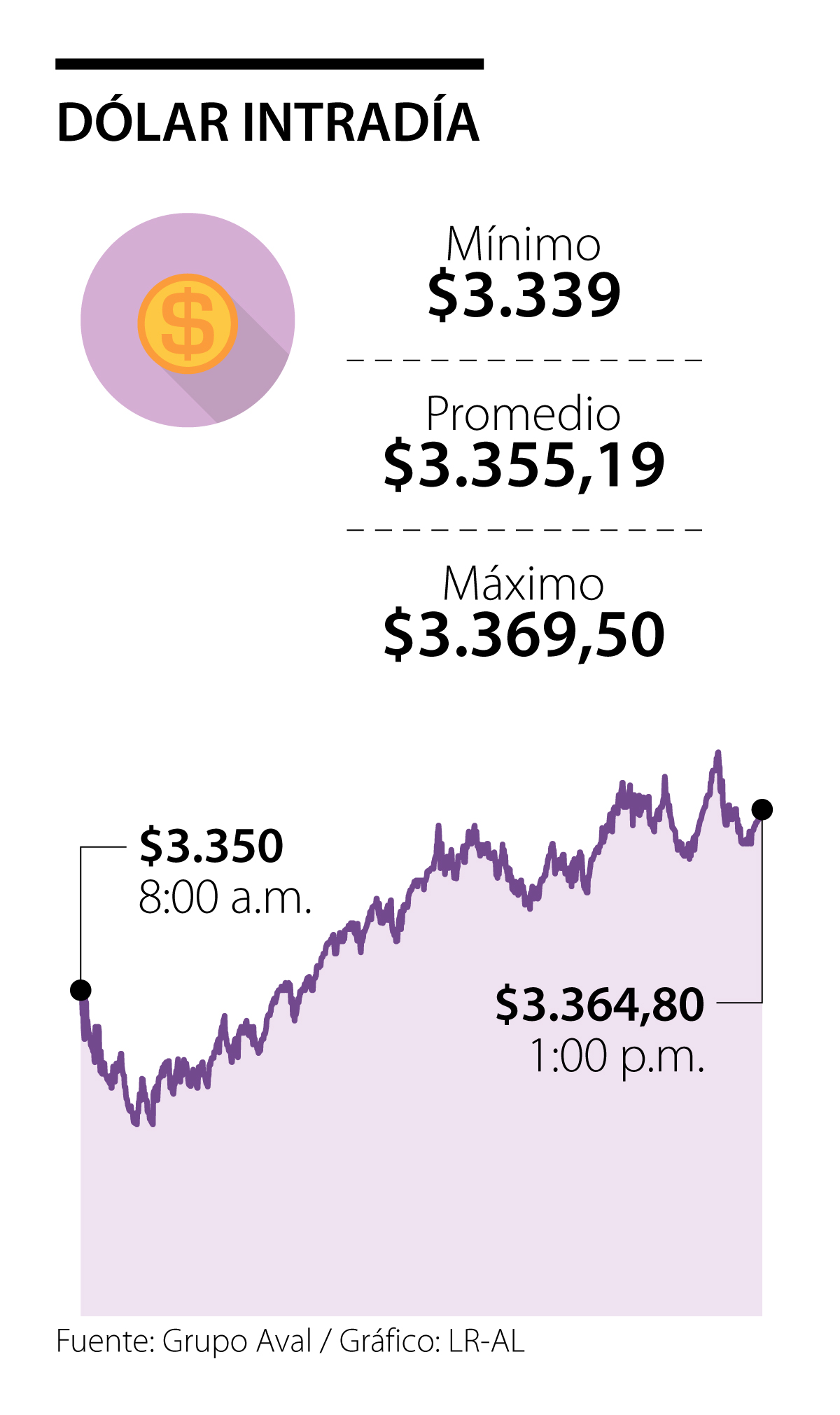 La divisa estadounidense se negoció a la baja este miércoles en un promedio de $3.355,19 y registró una depreciación de $12,1 frente a la TRM