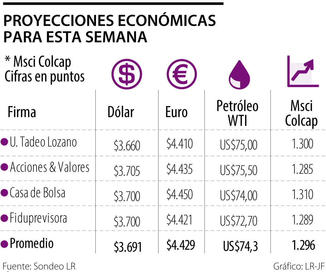 El euro estará en promedio a $4.429 mientras que el barril de petróleo WTI se cotizará a US$74,3 y el índice Msci Colcap a 1.296 puntos
