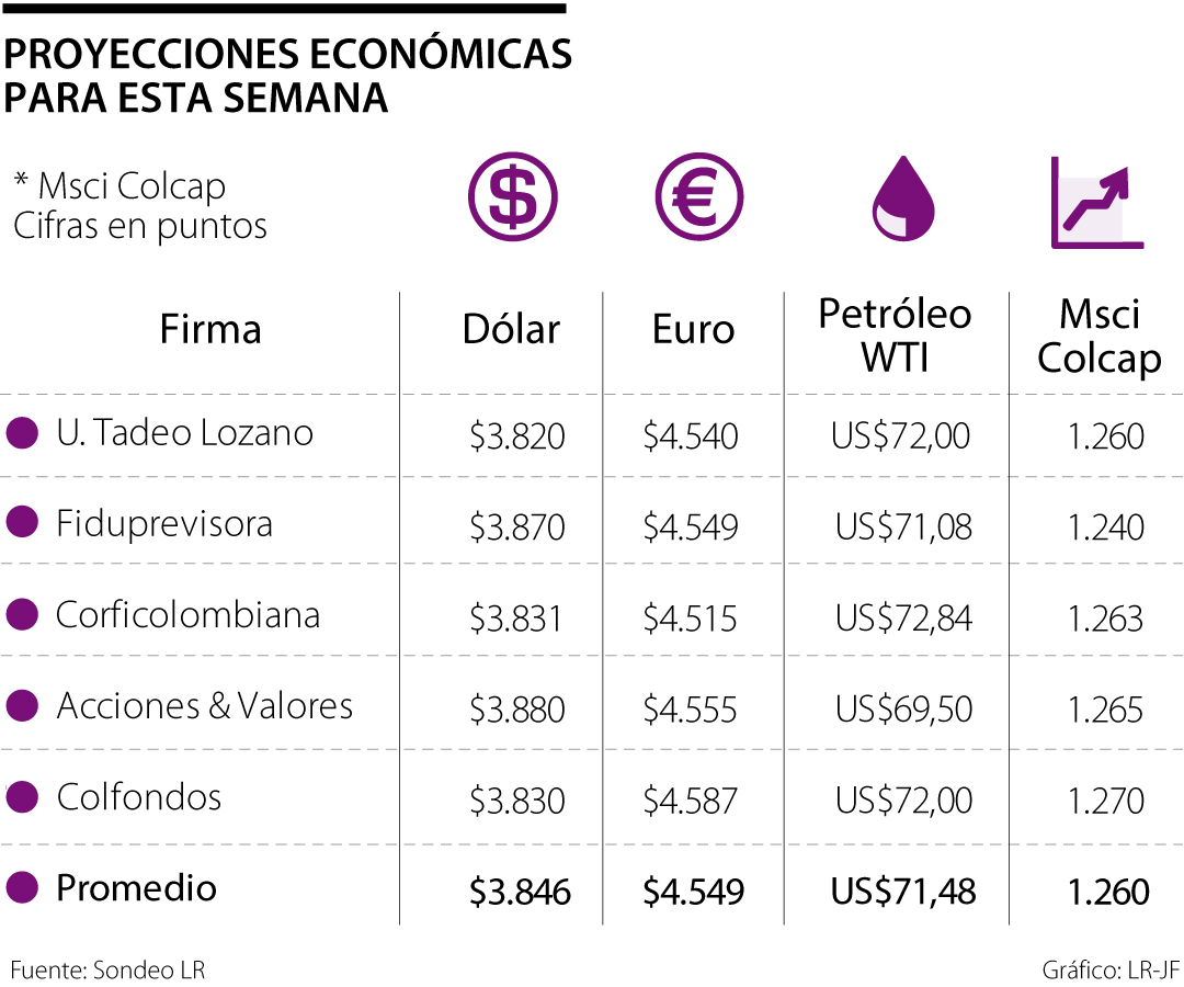 El barril de petróleo WTI llegará a US$71,48, el euro tocará los $4.549 en promedio, mientras que el Msci Colcap a 1.260 puntos