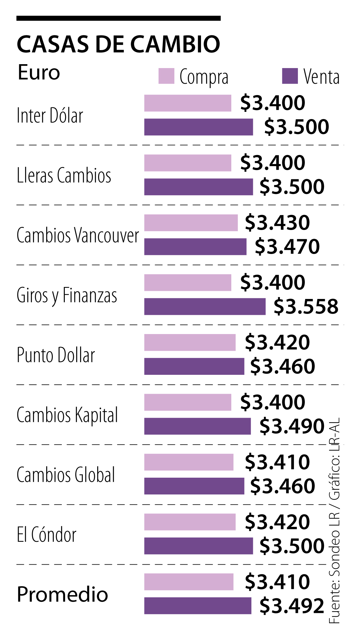Esta semana, las principales casas de cambio del país venderán el euro en un promedio de $3.492, es decir, $180 menos que el precio del mercado, que ronda los $3.673.