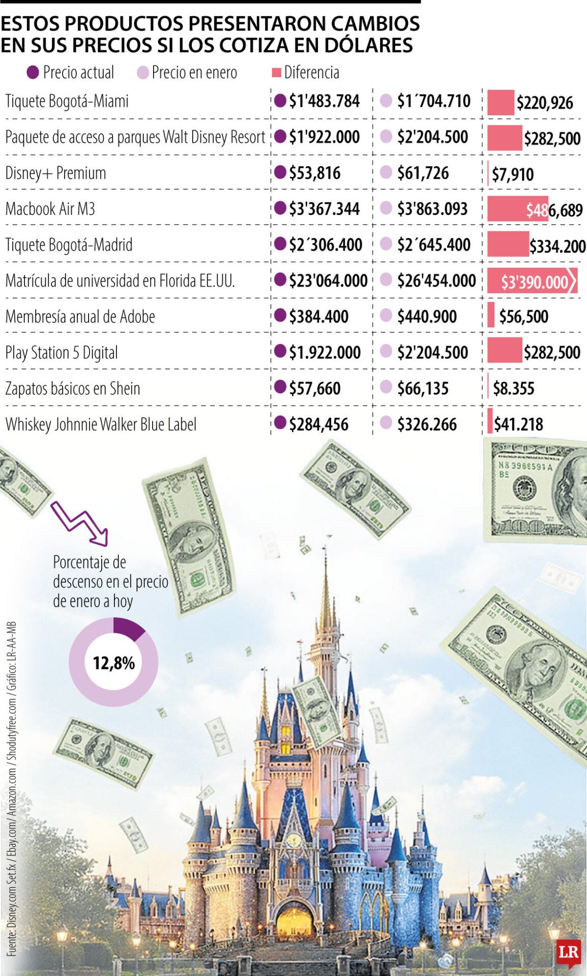 El dólar cayó a $3.844, su nivel más bajo en 15 meses. Desde el primero de enero, la tasa de cambio bajó casi $600. Eso significa una cosa: compras en dólares 13% más baratas que a inicio de año, entre las que están, entradas a parques de EE.UU., inversiones en ETF’s, compras tecnológicas y matriculas de estudios en el extranjero.