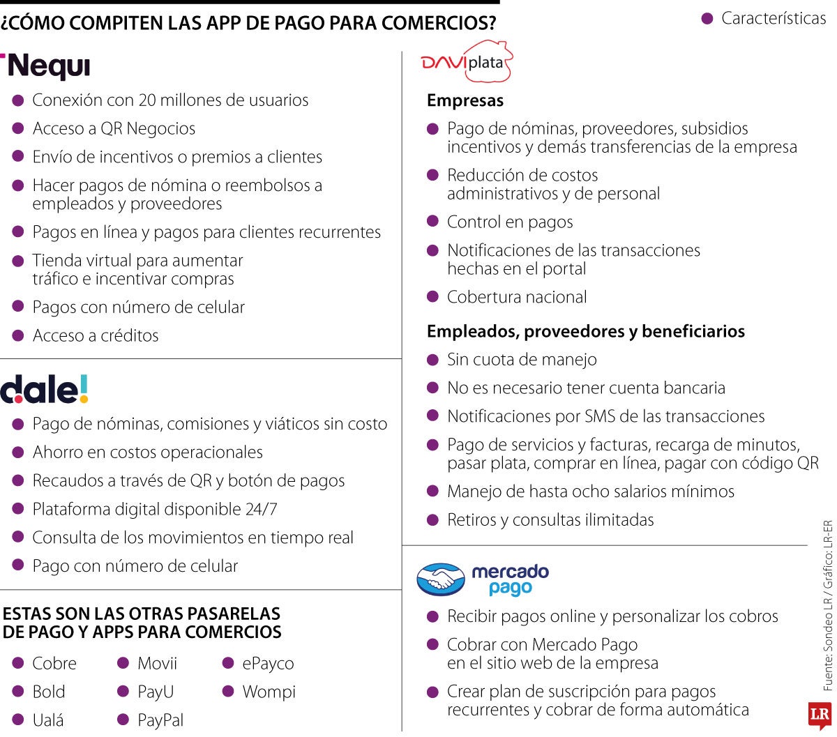 DaviPlata tiene pagos por QR, pagos de nómina y a proveedores, control de pagos, y se publicita como una app que reduce los costos administrativos y de personal. En el caso de Mercado Pago, la empresa es una pasarela de pagos, con la cual se puede personalizar los cobros. Ofrece botones de pago para un sitio web, links para redes sociales, así como un código QR.