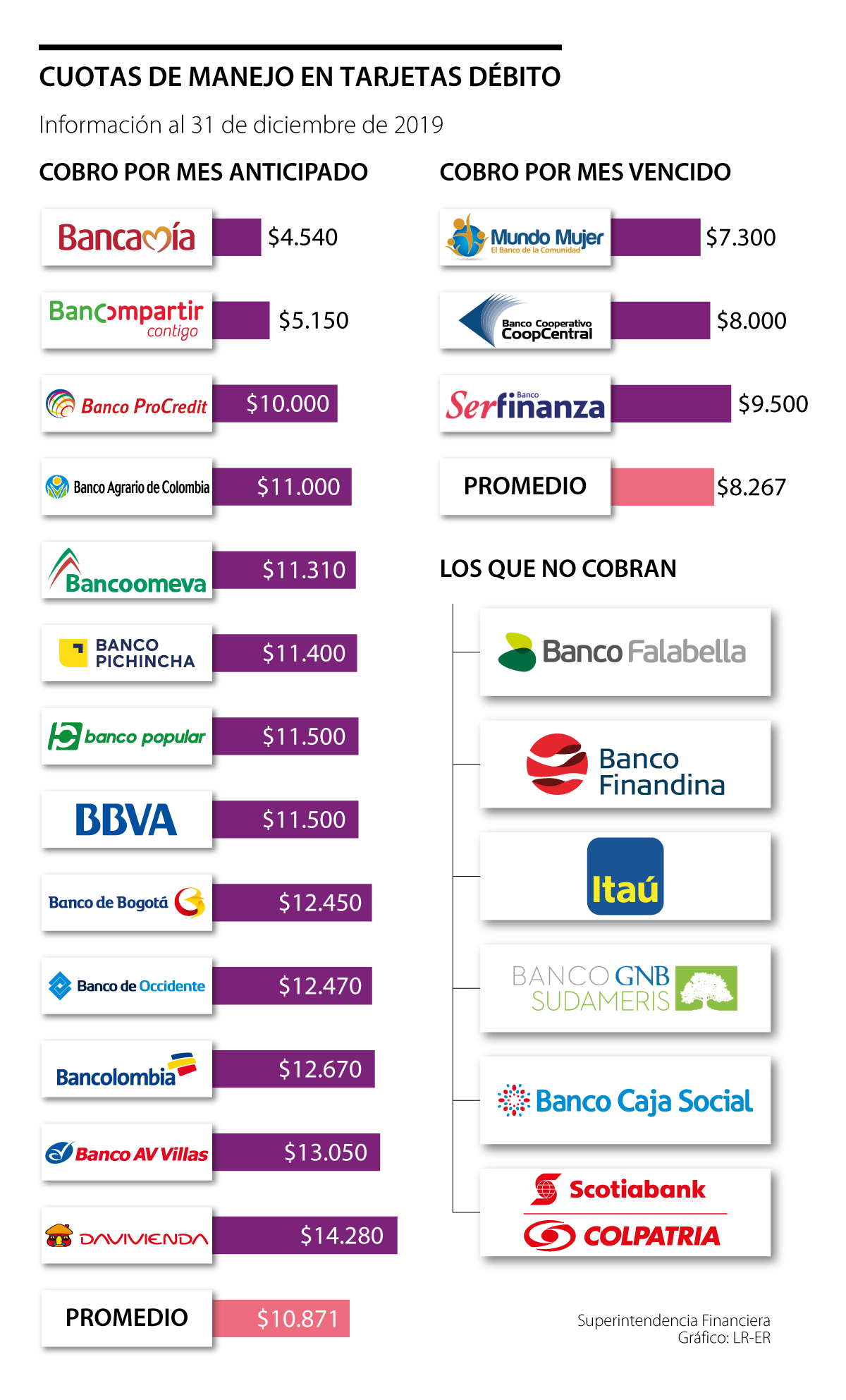 Por lo anterior, LR basado en cifras de la Superintendencia Financiera, con corte a 2019, enumeró las tarifas que los bancos ofrecen a sus usuarios en cuotas de manejo para las tarjetas débito.