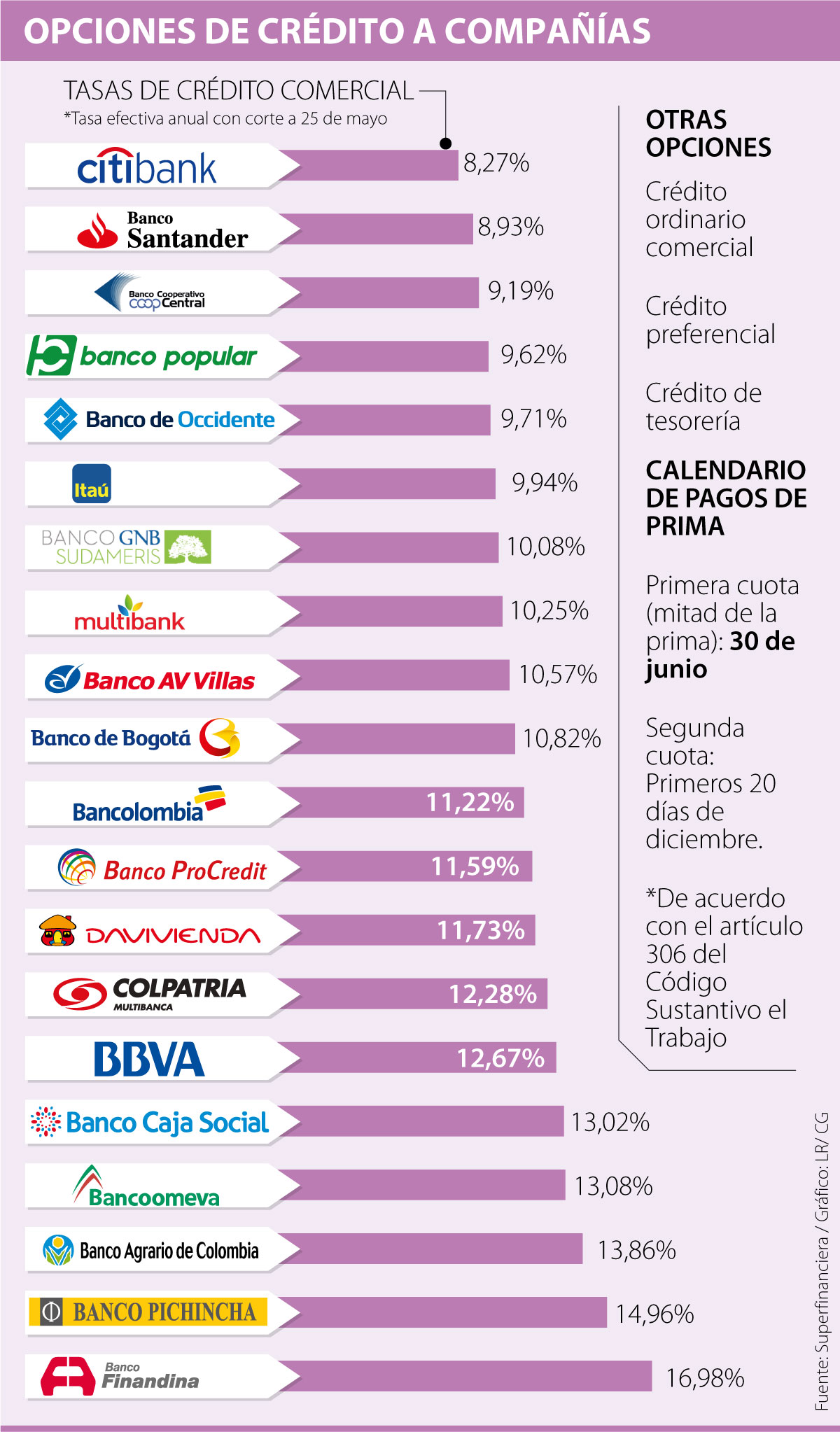 Así que para evitar estas multas y cumplir las obligaciones, las compañías tienen múltiples posibilidades de crédito. Entre la oferta de los bancos se encuentran opciones como el crédito ordinario comercial, el crédito preferencial y el crédito de tesorería. El primero de estos es el más ofertado, siendo 24 los bancos que registran antes la Superintendencia Financiera este servicio, con una tasa efectiva anual de 14,7% en promedio.