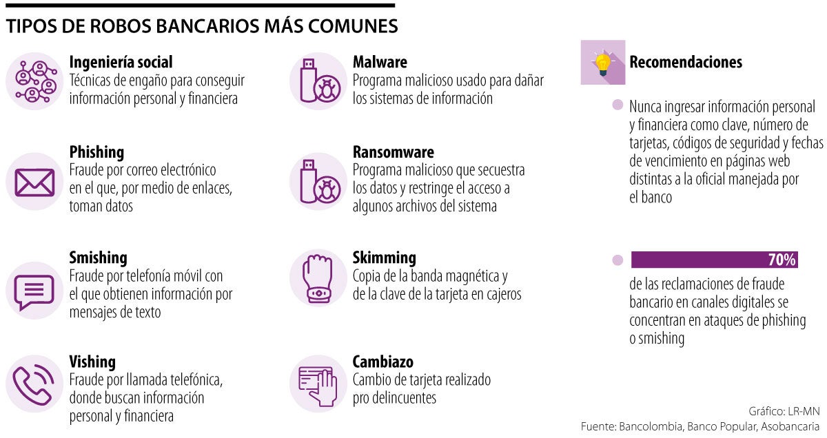 Los fraudes y robos bancarios son cada vez más recurrentes, sobre todo en épocas de fin de año en las que el número de transacciones aumenta. Según cifras de la Asociación Bancaria y de Entidades Financieras de Colombia (Asobancaria), 70% de las reclamaciones de fraude bancario en canales digitales se concentran en ataques derivados de técnicas de phishing o smishing.