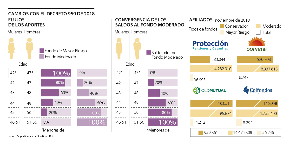 La norma establece que 100% de los aportes de las mujeres menores de 42 años y de los hombres menores de 47 años que no hayan escogido un fondo serán destinados al de mayor riesgo. A medida que la persona envejece, el porcentaje en el fondo de mayor riesgo disminuye en 20 puntos porcentuales y la participación en el fondo moderado aumenta 20 puntos porcentuales.