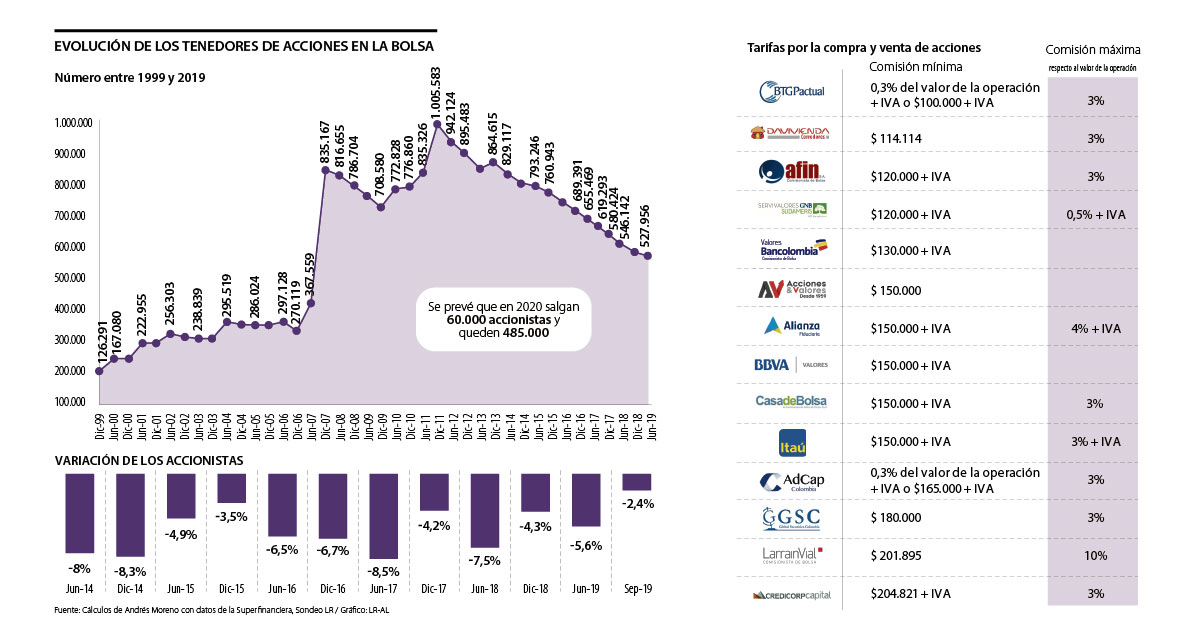“A través de la plataforma de negociación Homebroker, la comisión mínima es de $40.000 y dependiendo del monto puede variar entre un 0,2% y un 0,3%”, indicó David Guerrero, gerente de renta variable de Davivienda Corredores, quien añadió que el monto mínimo para negociar acciones en esta herramienta es $1 millón.