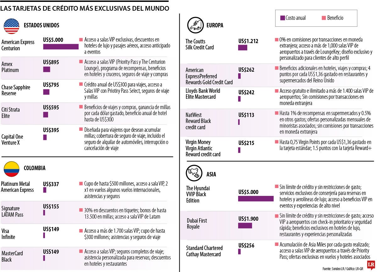 En el caso de Colombia, está la Platinum Metal American Express, la más exclusiva del país. Con un costo anual de US$337, tiene un cupo hasta de US$500 Millones y acceso a salas VIP en aeropuertos. También está la Signature LATAM Pass, de US$155, exclusiva para viajes y con descuentos hasta de 30% en tiquetes y bonos de 13.500 en millas para viajeros.