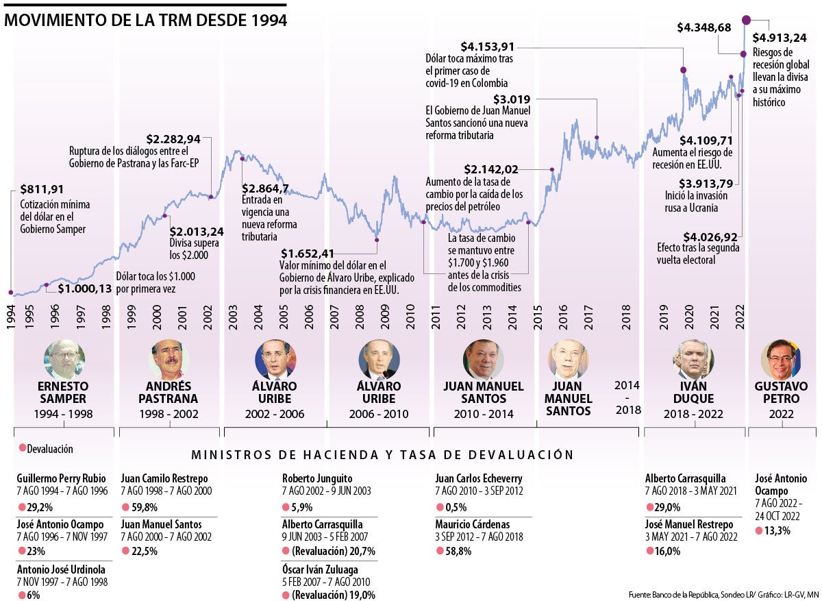 En el periodo de Iván Duque, con Carasquilla y José Manuel Restrepo la devaluación fue de 29% y 16%. En este periodo aumentó el riesgo a la recesión de EE.UU. e inició la invasión Rusa a Ucrania, factores que explican el comportamiento del dólar.