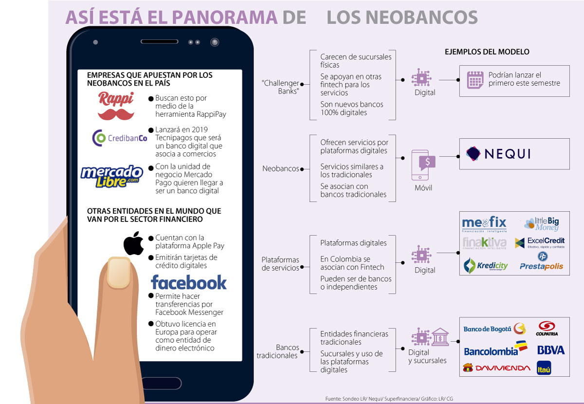 Aunque Colombia ha avanzado, hasta ahora está en los primeros pasos de estos desarrollos, ya que en el mundo entidades como Facebook, Apple, WeChat, Google y Amazon ya ofrecen servicios financieros como tarjetas de crédito digitales, transacciones y monederos virtuales dentro de sus plataformas. Acá se debe tener en cuenta que los challenger banks siguen siendo otro tipo de bancos, por lo que Carlos Castro, director de ventas de VeriTran, explicó que estos son bancos nuevos 100% digitales que tienen licencia del gobierno para operar”.