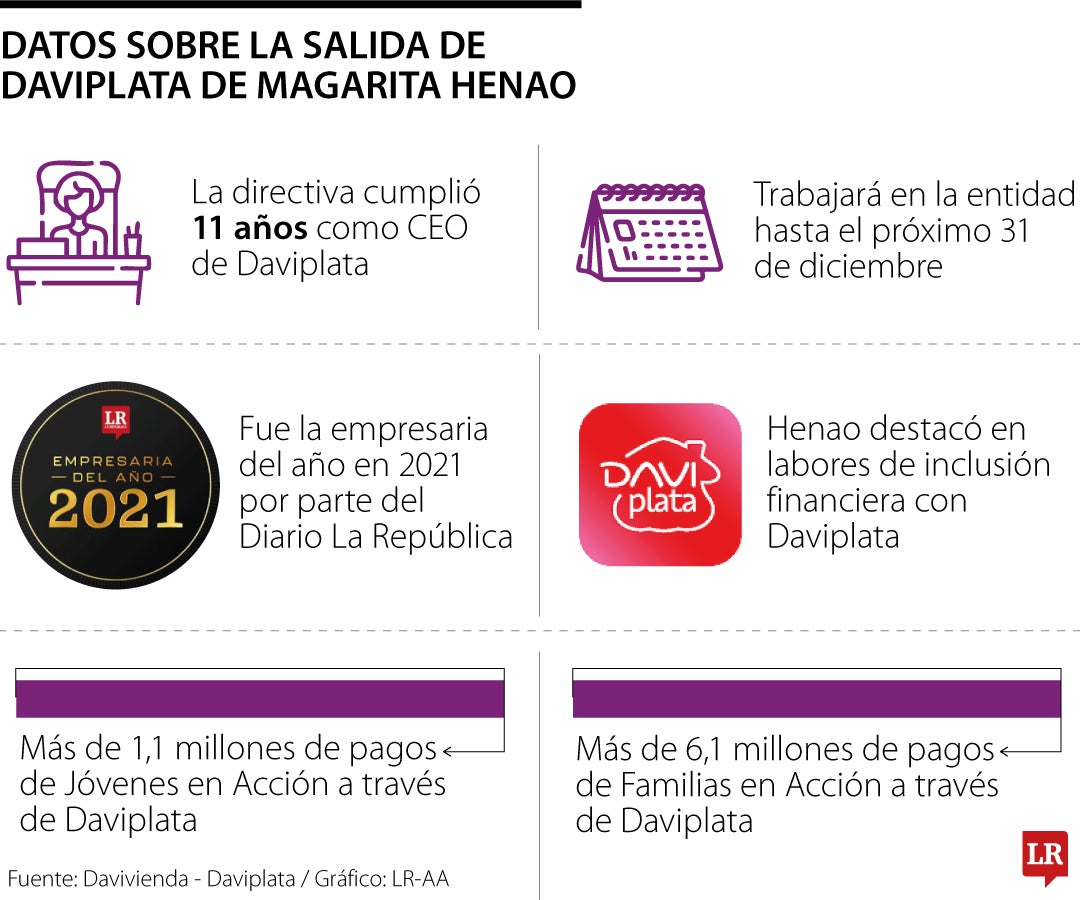 Recientemente se hizo oficial la renuncia de Margarita Henao del cargo de CEO de Daviplata, antes billetera digital, ahora neobanco. Después de 11 años en el cargo, la empresaria trabajará en la entidad hasta el próximo 31 de diciembre, donde se hará finalmente efectiva su renuncia anunciada días atrás.