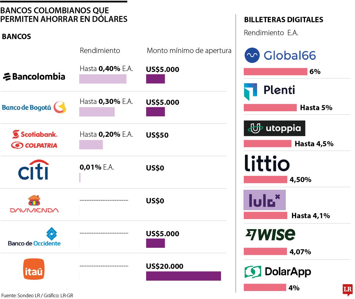 Entre los bancos que cuenta con esta posibilidad se encuentran Bancolombia, Banco de Bogotá, Scotiabank Colpatria, Citibank, Davivienda, Banco de Occidente y Banco Itaú. Pese a que todos cuentan con la misma posibilidad, algunos cuentan con una cantidad mínima para poder realizar la apertura de la cuenta; este monto mínimo oscila entre US$0 y US$20.000 dependiendo la entidad bancaria.