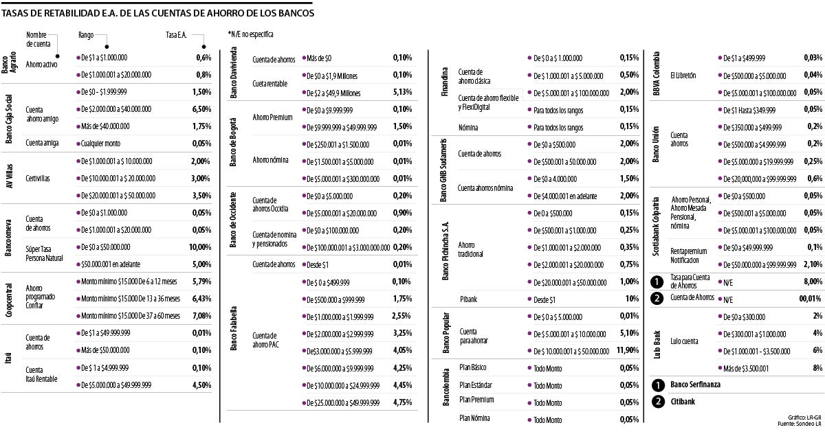 Estas son las mejores opciones que ofrecen los bancos, pues otros, que también manejan rentabilidades altas con cuentas de ahorro premium o específicas, piden montos mínimos de más de $10.000 millones.