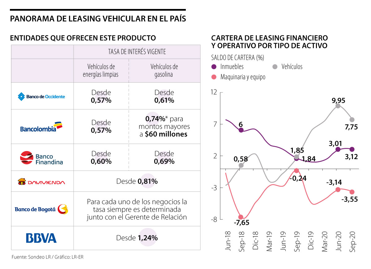 Existen otras propuestas de leasing vehicular en el sistema financiero colombiano (ver gráfico). Sin embargo, no todos los bancos tienen la preferencia para vehículo de tecnologías limpias.