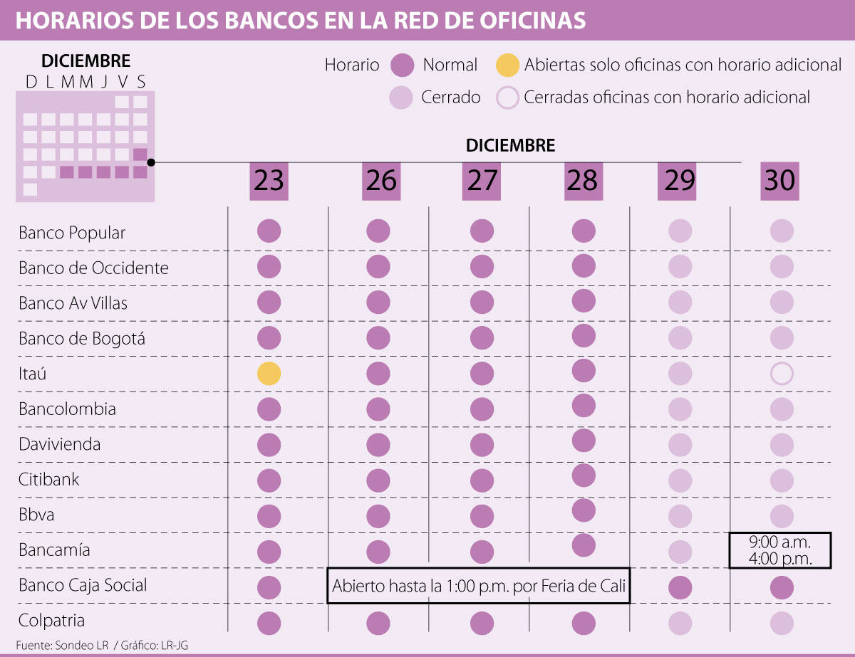 Las excepciones, según un sondeo de LR entre los 12 principales bancos del país son Bancamía, que abrirá también el 29 y 30 de diciembre en los horarios habituales; Itaú, que solo cerrará ese mismo día las oficinas de horario extendido, y el Banco Caja Social, que por la Feria de Cali tendrá abierto 26, 27 y 28 de este mes hasta la 1:00 p.m.