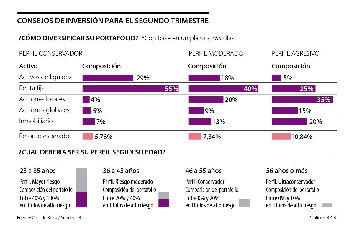 El principal consejo antes de invertir es revisar su tolerancia al riesgo, para lo cual se debe tener en cuenta su edad (a mayor edad, menor riesgo), su capacidad para tolerar pérdidas y el horizonte de inversión, que básicamente indica cuándo quiere sus retornos. El perfil de riesgo conservador se acomoda a personas entre 46 a 55 años, un perfil ultraconservador es recomendado para quienes tienen más de esa edad. El perfil moderado es sugerido para personas entre 36 y 45 años, mientras que el perfil más agresivo va desde los 25 hasta los 35 años.