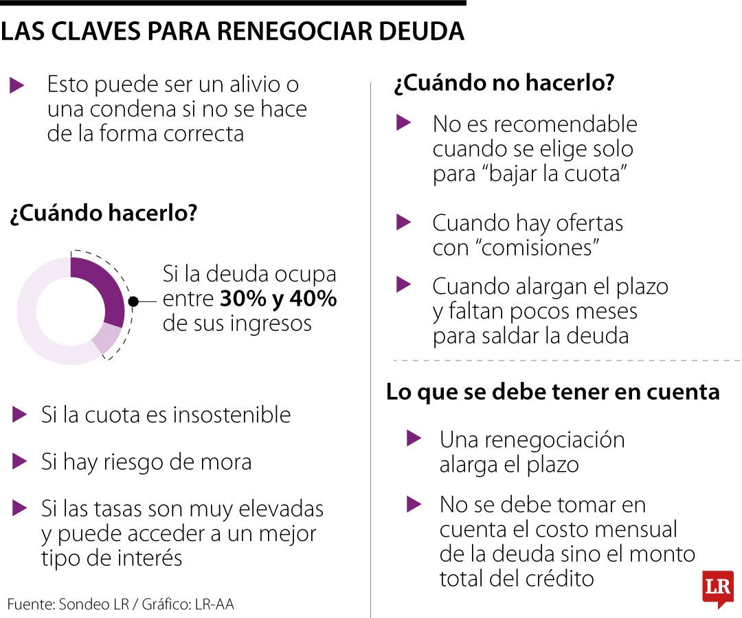 Pero también debe saber cuándo no negociar una deuda, porque le perjudicaría aún más sus finanzas. Por ejemplo, la asesora financiera Karem Suárez, dijo que renegociar cuando la cuota es insostenible, por lo que aclaró que no es buena decisión si se incrementa la tasa a la del mercado actual.