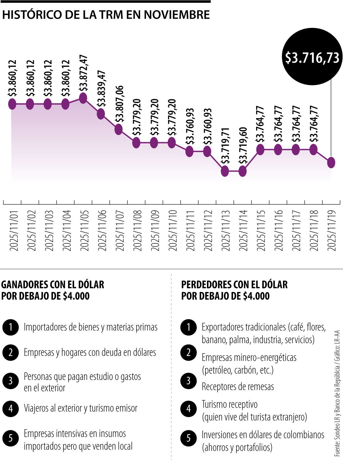En cuanto a los actores del mercado que pierden con este precio de la divisa están los exportadores tradicionales, aquellos que venden productos como café, flores, banano, palma y servicios. “Son compañías que venden al mundo y reciben en dólares, pero tienen sus costos mayoritariamente en pesos. Cada dólar exportado se convierte en menos pesos, recortando ingresos y márgenes”, aseguró Vieira.