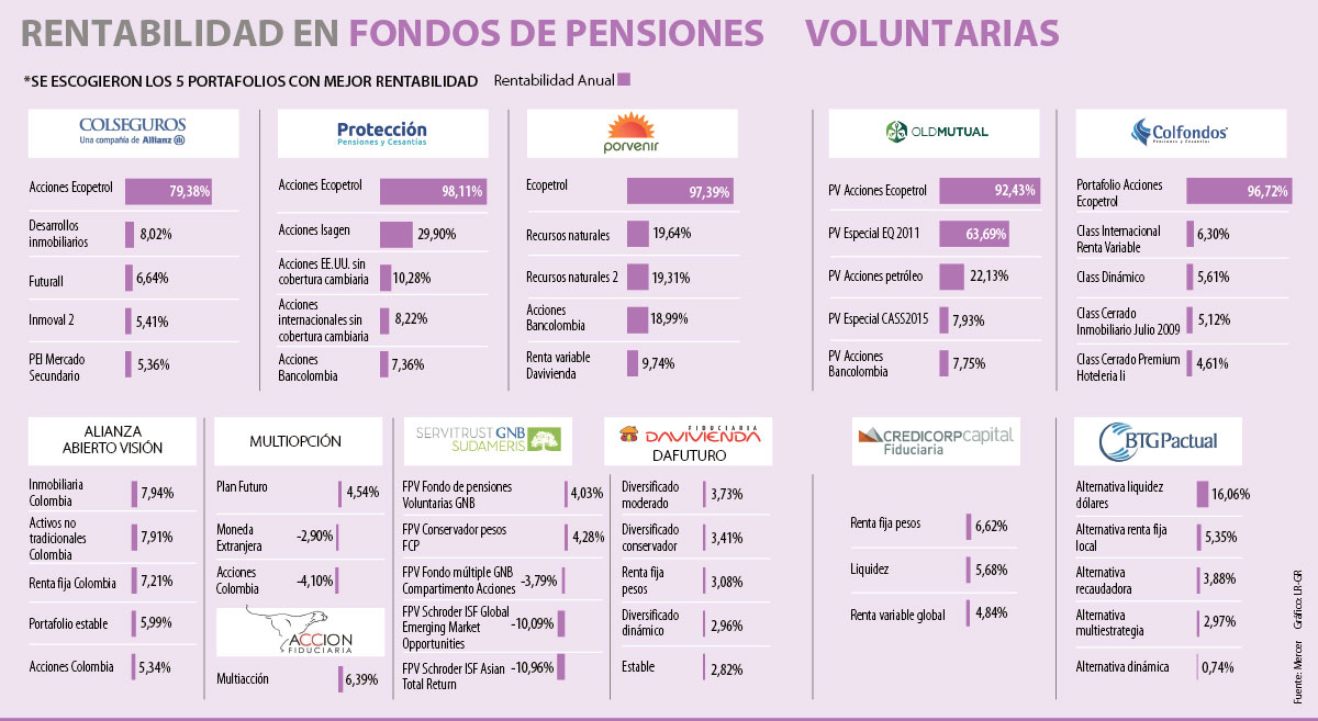 Y como las opciones son amplias, los fondos que tienen las mejores rentabilidades en el año también tienen opciones en desarrollos inmobiliarios. Este es el caso de Colseguros, que rentó 8,02% anual con esta opción. Acciones de Isagen de Protección con 29,90% también fue una buena opción que resaltaron los expertos y el de acciones de petróleo ofrecido por Old Mutual, que rentó a 22,13%, también estuvo entre los destacados. (Ver cuadro)