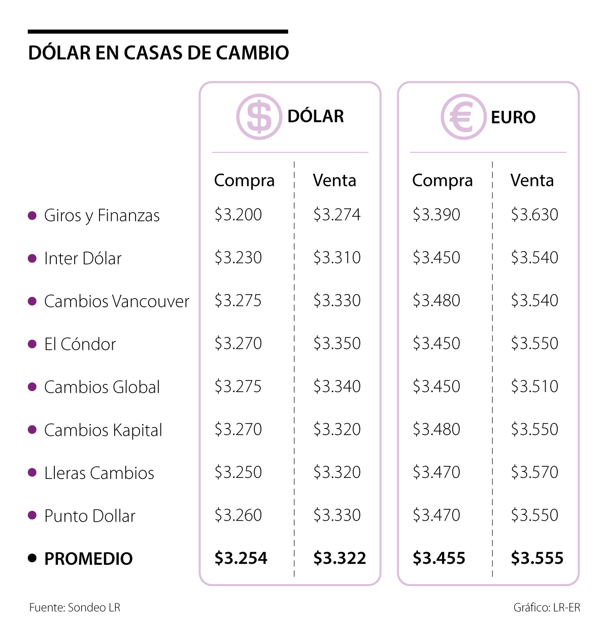 De las casas de cambio consultadas por LR, donde se podrá adquirir el billete más barato es Cambios Global, que estará cobrando $3.510 por la unidad, seguido por Cambios Vancouver e Inter Dólar, que lo venderán a $3.540. Las casas de cambio con el precio de venta más alto son Lleras Cambios, que pide $3.570, y Giros y Finanzas, que tiene un valor de $3.630.