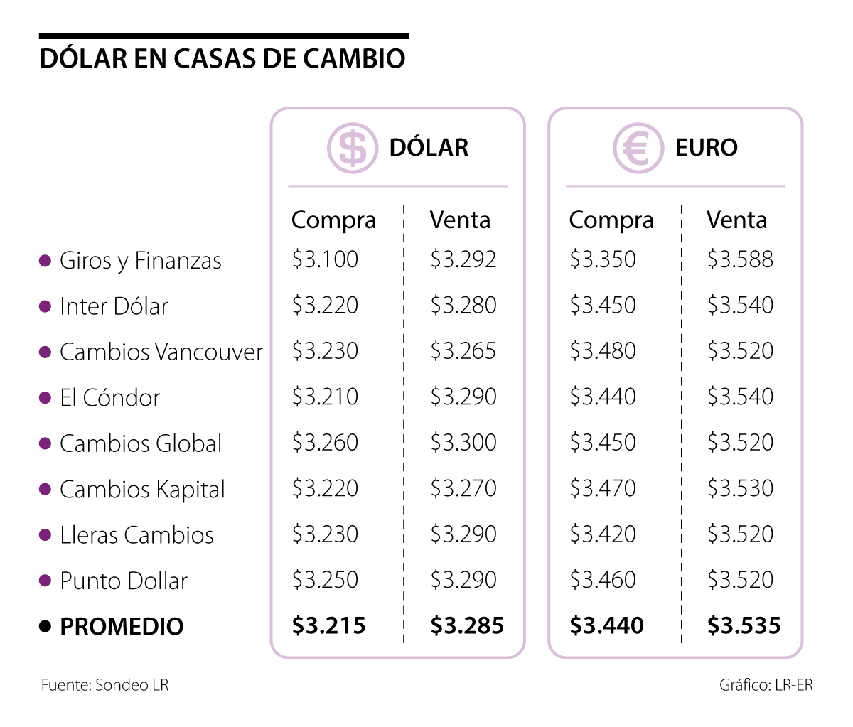 Las firmas que menos le pagarán por la divisa estadounidense son Giros y Finanzas, que ofrece $3.100, y El Cóndor, que paga $3.210.