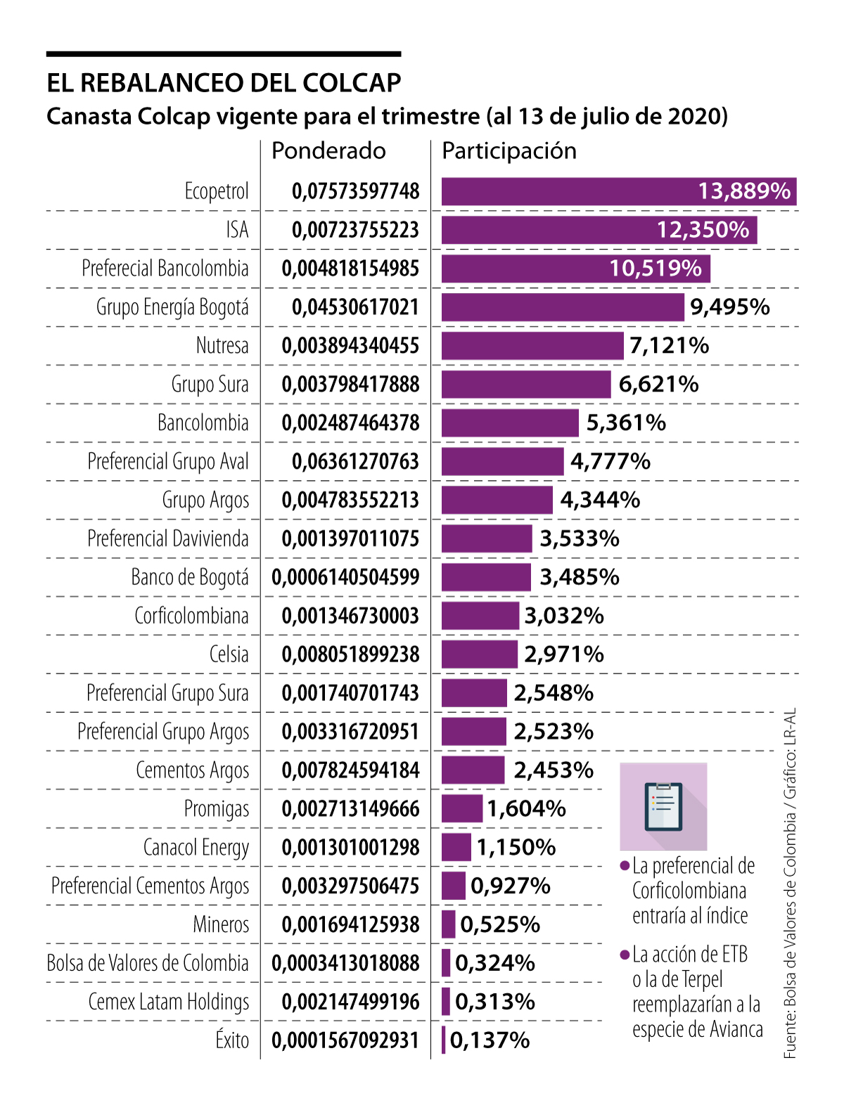 En los días previos a la fecha del corte de datos del rebalanceo, que es hoy, varias comisionistas presentaron sus cálculos sobre cuáles serían las especies más opcionadas para ingresar al índice. La mayoría coincidió en que la preferencial de Corficolombiana hará parte de la canasta y que la especie de ETB reemplazará a la de la aerolínea. La canasta informativa se conocerá el 24 de julio y la definitiva, el 31 de julio.