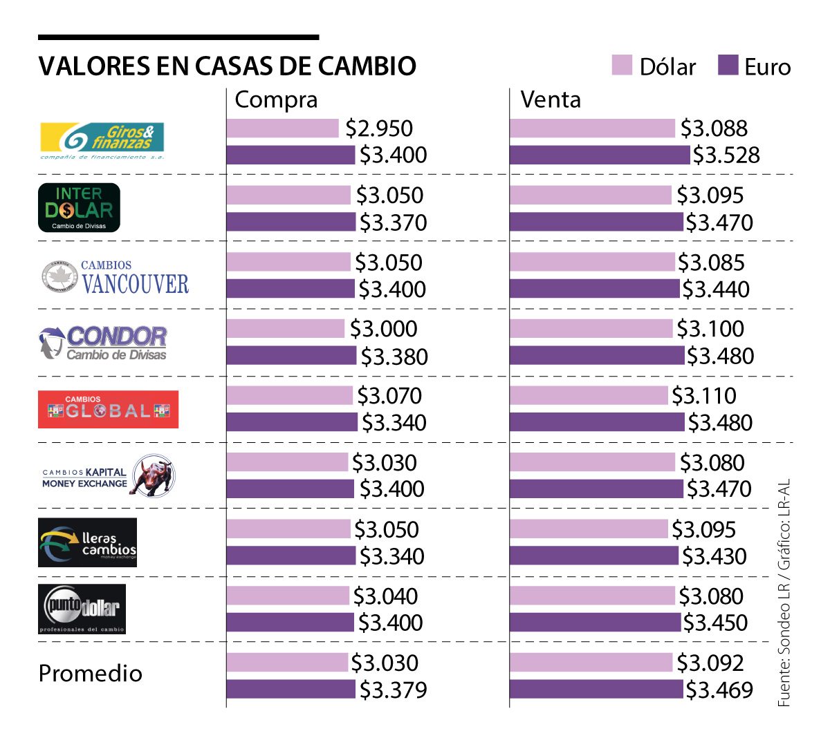Al hacer una revisión de los valores publicados en ocho de las principales casas de cambio del país, se refleja que el euro se venderá, en promedio, a $3.469, precio que se ha mantenido estable durante todo julio y que representa una variación de apenas $5 más con relación a su precio de hace dos semanas.
