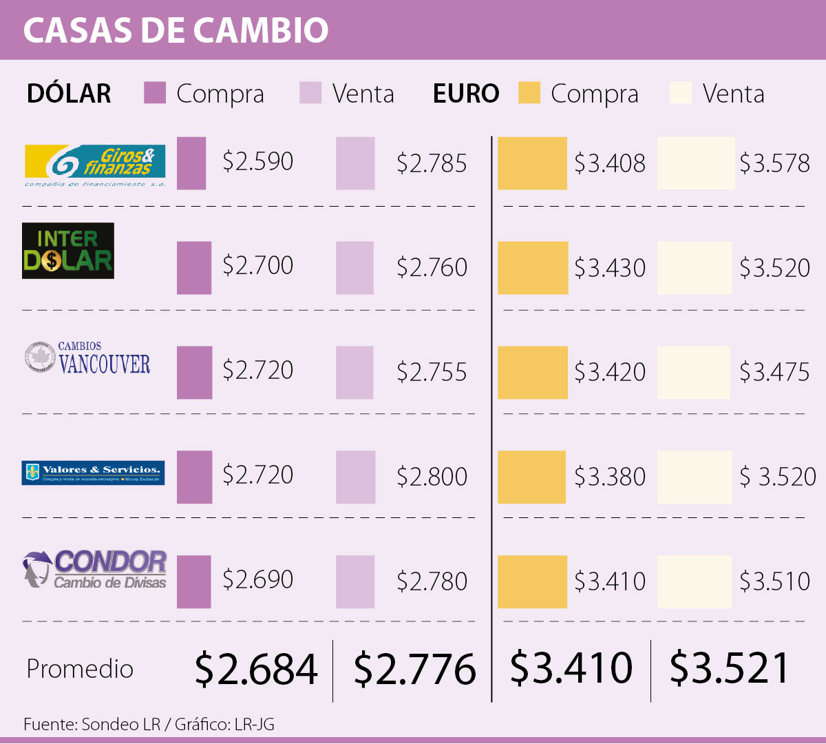 Por su parte, la tarifa mínima para comprar euros es de $3.380 y el precio máximo será de $3.430, según el sondeo elaborado por este medio.