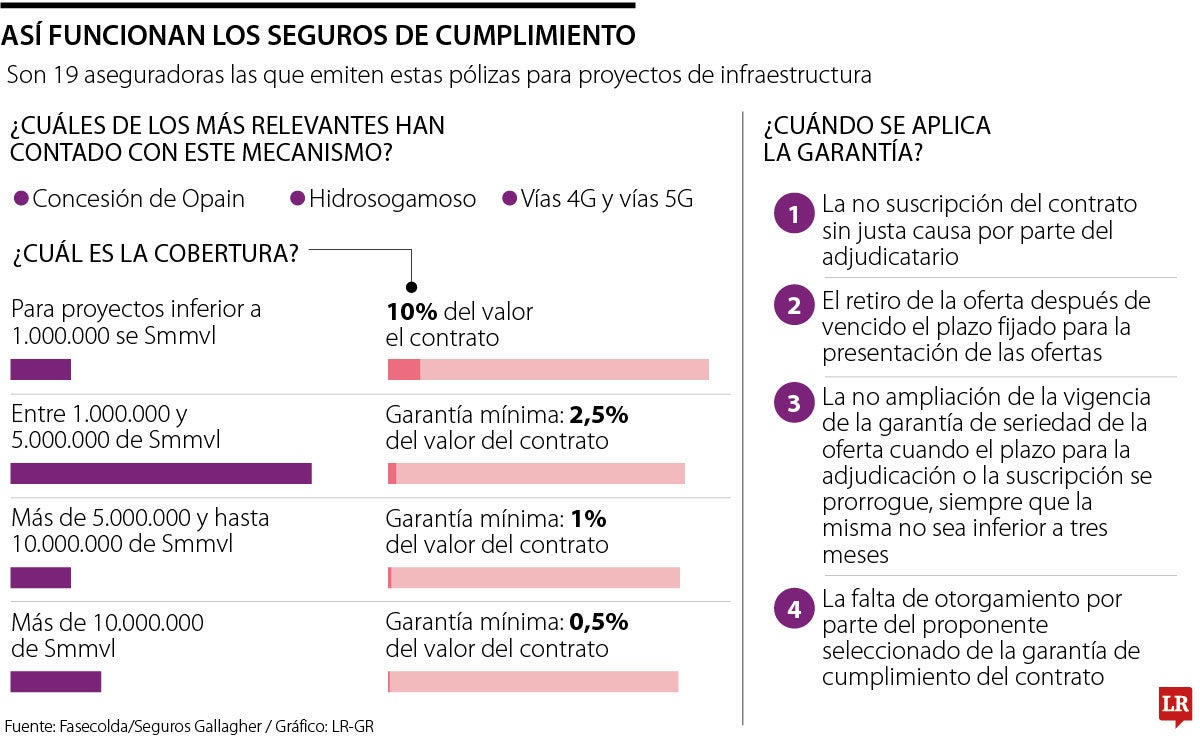 Este tipo de seguros le garantiza al ente contratante que el adjudicatario cumplirá las obligaciones derivadas del contrato. En estos momentos, de acuerdo con información de Fasecolda, son 18 empresas que manejan pólizas de cumplimiento. Por ejemplo, la entidad gremial destacó que gracias a estas pólizas se han llevado a cabo grandes proyectos como las vías 4G y 5G, así como la concesión de Opain o el proyecto de Hidrosogamoso.
