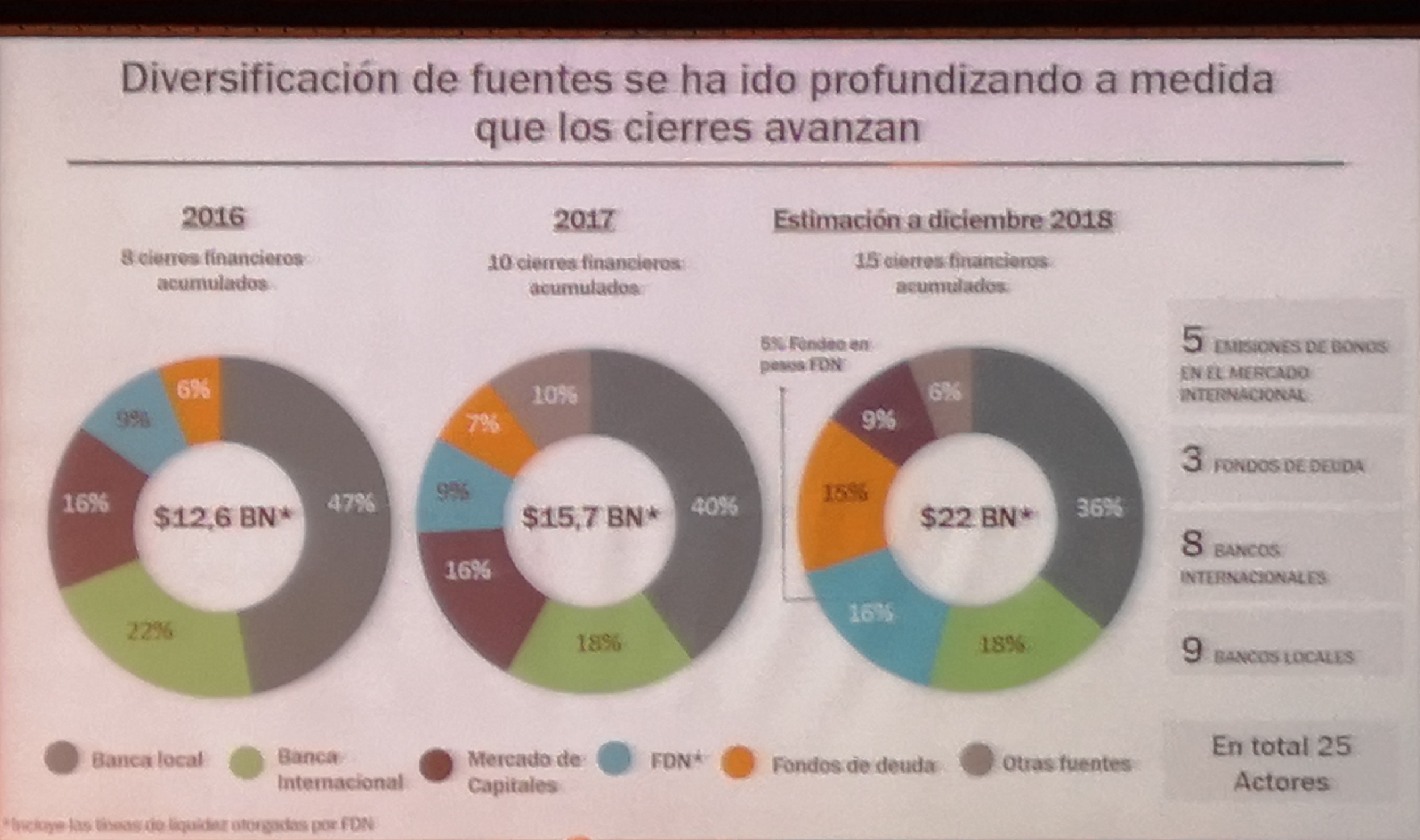 "Con esto logramos tres jugadores nuevos para invertir pues no muchos se estaban arriesgando a nivel local por los problemas que han impactado el sector como el conflicto en Ruta del Sol. Mientras la banca local se frenaba la banca internacional pudo entrar", señaló Del Valle, quien añadió que los cierres financieros alcanzarían una suma cercana a los $22 billones a final de año.