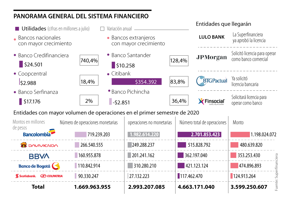 Además de entrar a un sistema financiero que está golpeado por la crisis económica desatada por el covid-19, las nuevas entidades tendrán que enfrentarse a un panorama en el que Bancolombia y Davivienda son los bancos que movieron más de 69% del total de las operaciones registradas por el sistema financiero al cierre de junio de 2020, con 2.701 millones y 515 millones de transacciones, respectivamente.