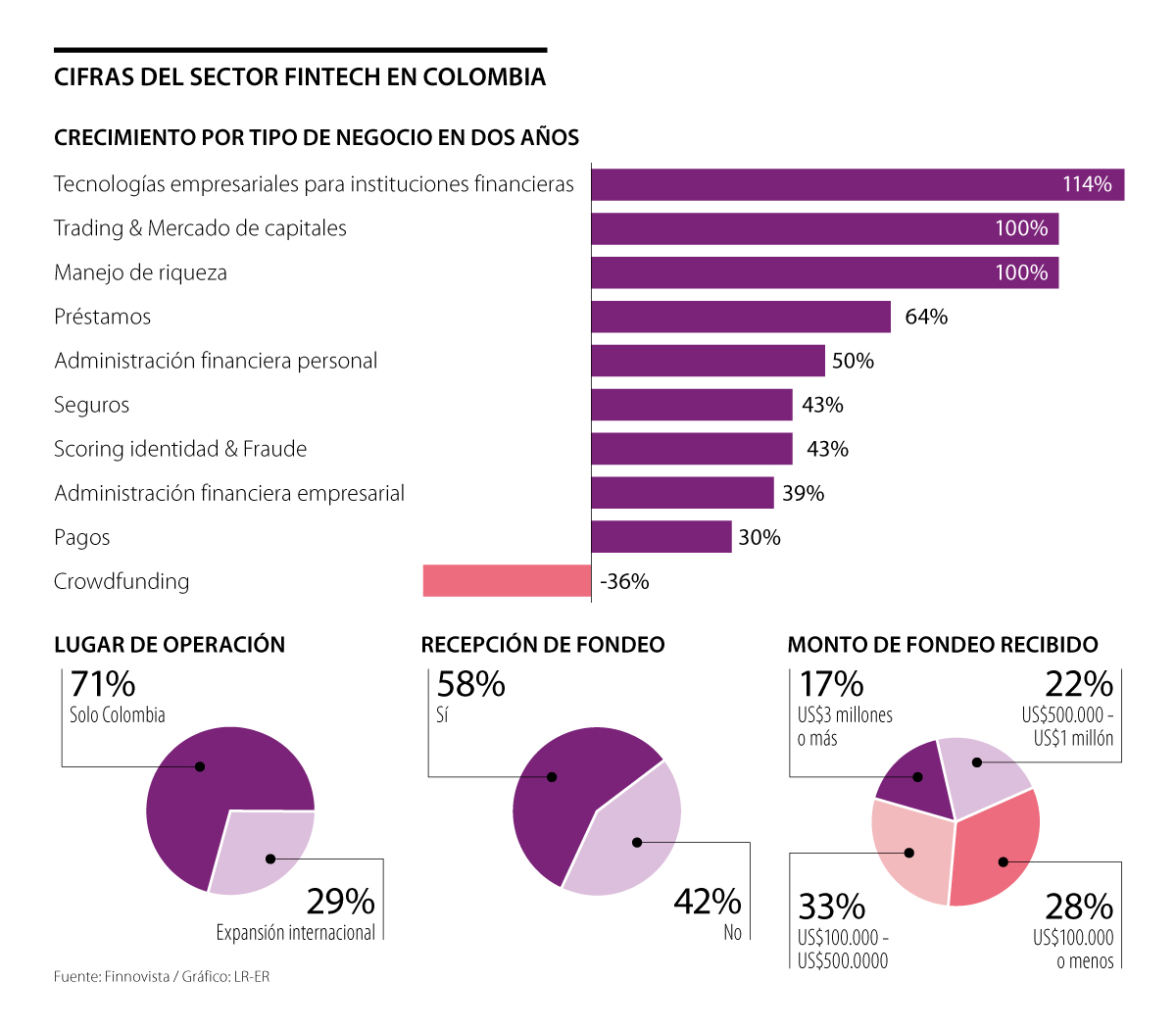 Al revisar las características del ecosistema fintech local, 61% son oriundas de Bogotá y 29% de Medellín, el resto se divide entre Barranquilla, Manizales y Villavicencio. Además, de 100%, 71% opera solo en Colombia y el resto internacionalmente, datos que explican el monto de fondeo más recurrente de parte de los inversionistas, el cual oscila entre US$100.000 y US$400.000.