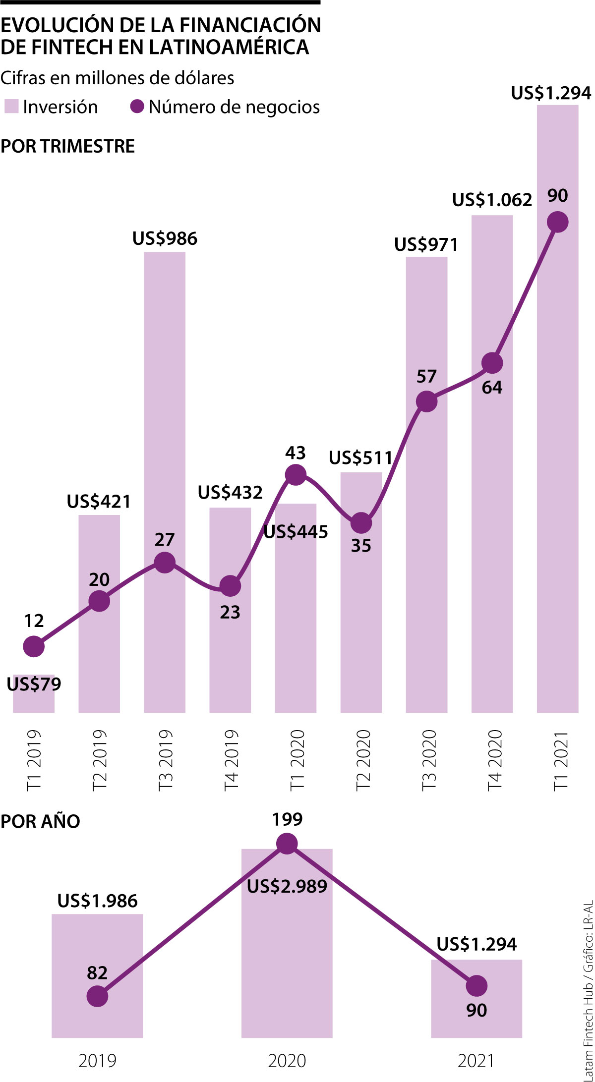 LatamFintech Hub publicó los datos de inversiones en las fintech de la región desde 2019. El financiamiento de terceros en estas empresas del sector ha crecido exponencialmente. Mientras en 2019 se cerraron 82 tratos y se recaudaron US$1.986 millones, en 2020 se cerraron 199 acuerdos y se financió un monto de US$2.989 millones. En el primer trimestre del año, se hicieron 90 rondas (20 no fueron reveladas) y se recaudaron US$1.294 millones, de los cuales US$862 millones fueron inversiones de capital y US$431 millones se registraron como financiamiento de deuda.