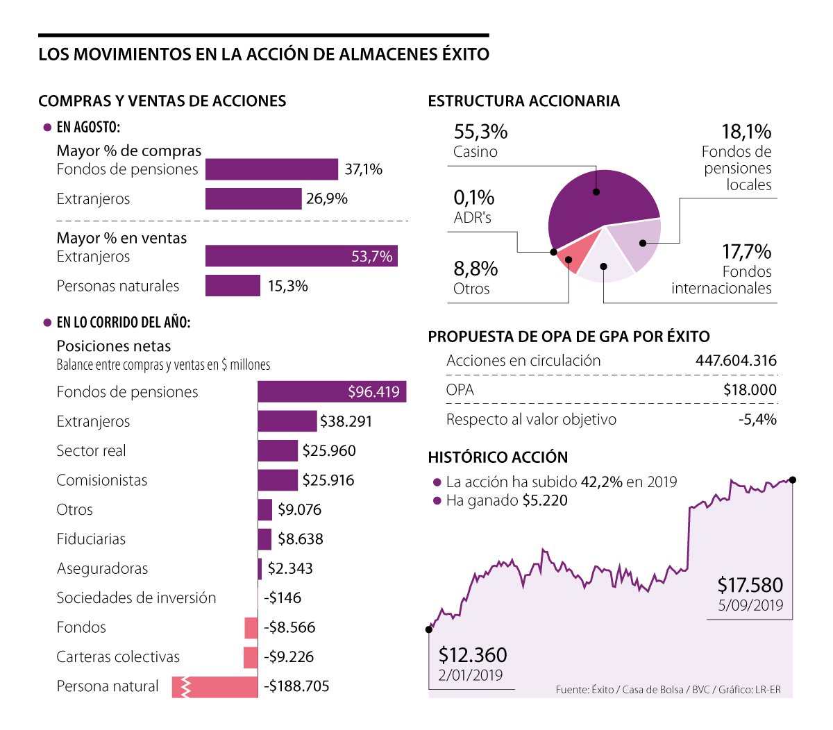 La francesa ofrece $18.000 por cada acción del Éxito, un monto que, para Suárez, “representa un castigo de 5,4% respecto al valor fundamental”, pese a que se mejoraron las condiciones, lo que no genera “un mejor escenario para los accionistas minoritarios”.