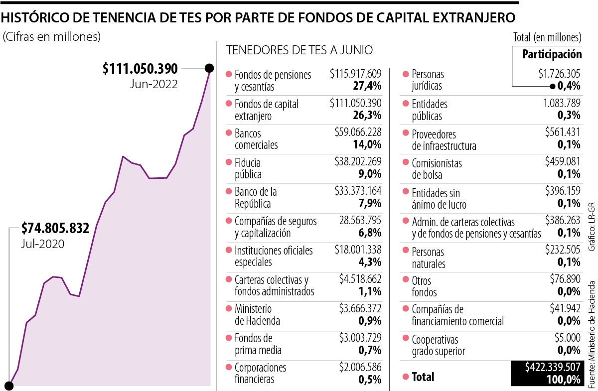 Con las compras que se registraron a junio, los fondos de capital extranjero ya poseen 26,29% de los títulos públicos en circulación, siendo los segundos mayores tenedores de TES y, de hecho, están cerca de alcanzar a los Fondos de Pensiones y Cesantías, que son dueños de 27,45% del total. Completando el top cinco están los bancos comerciales (13,99%), el resto del sector financiero (12,65%) y el sector público (10,88%).