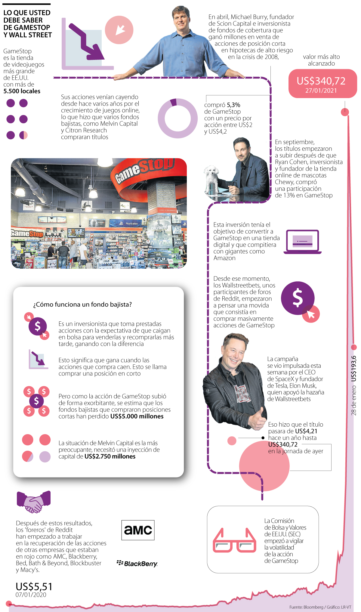 Esto aumentó aún más la demanda por las acciones de GameStop, al punto que se estima que los fondos bajistas que compraron posiciones cortas han perdido US$5.000 millones. Incluso, Melvin Capital, uno de los fondos que más apostó por esta especie antes de la campaña de los usuarios de Reddit, necesitó una inyección de capital de US$2.750 millones.