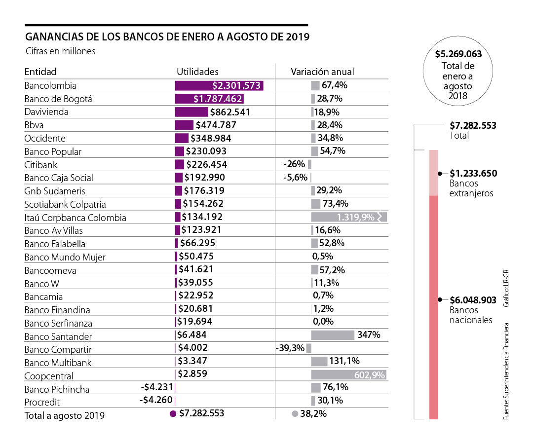 En total, de enero a agosto de 2019, solamente Bancolombia y Banco de Bogotá reportaron utilidades por $4,09 billones, lo que representa 56,15% de los $7,28 billones que ganaron los 25 bancos, entre nacionales y extranjeros, que operan en el país, según cifras de la Superintendencia Financiera.
