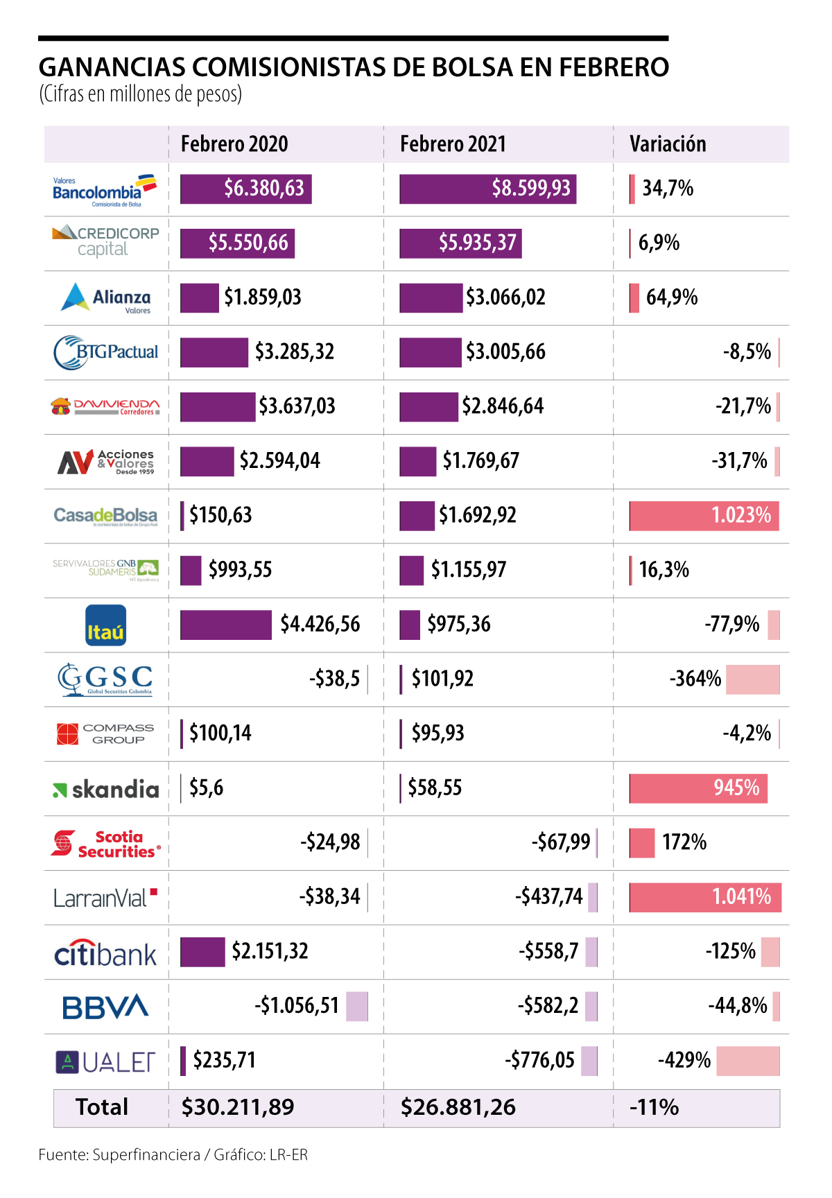 El más reciente reporte de utilidades de las firmas comisionistas de bolsa activas y vigiladas por la Superintendencia Financiera de Colombia (SFC) reveló que, en febrero de 2021, las ganancias de la industria sumaron $26.881,2 millones, lo que representó una caída de 11% frente al mismo mes del año anterior.