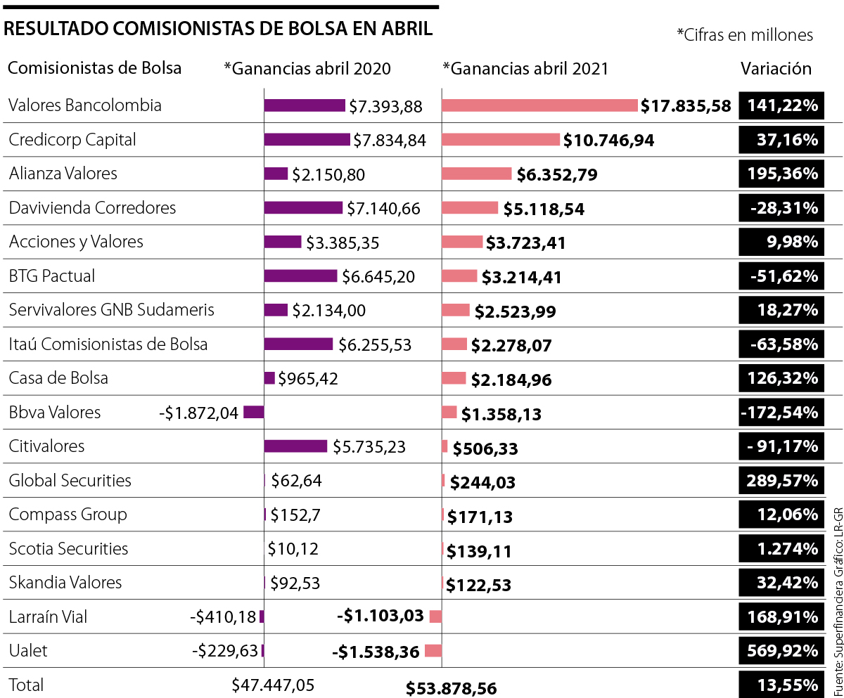 Las que más registraron ganancias fueron Valores Bancolombia, con $17.835 millones; Credicorp Capital, con $10.746 millones y Alianza Valores, con $6.352 millones.
