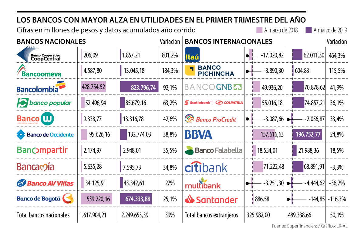 En cuanto a los bancos extranjeros, los que presentaron mayor crecimiento en sus utilidades al comparar las del primer trimestre de 2018 con las del mismo periodo de 2019 fueron Itaú, con 464,3%; Banco Pichincha, con 115,5%, y GNB Sudameris, con 41,9%.