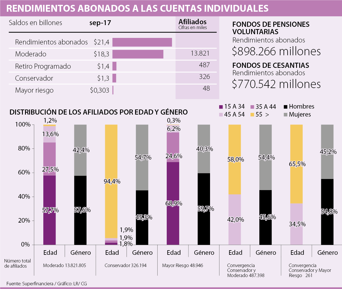En buena parte, los rendimientos totales fueron impulsados por el salto de 75% que tuvieron los beneficios de los fondos de pensiones moderados, debido a que se ubicaron en $18,3 billones, casi $8 billones más que hace 14 meses.