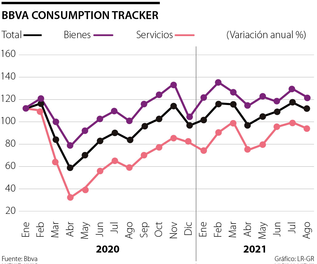 Bbva reveló el Consumption Tracker al 31 de agosto de 2021, un indicador de consumo que mide las transacciones realizadas con tarjetas débito y crédito y las desagrega según el sector económico al que pertenece.