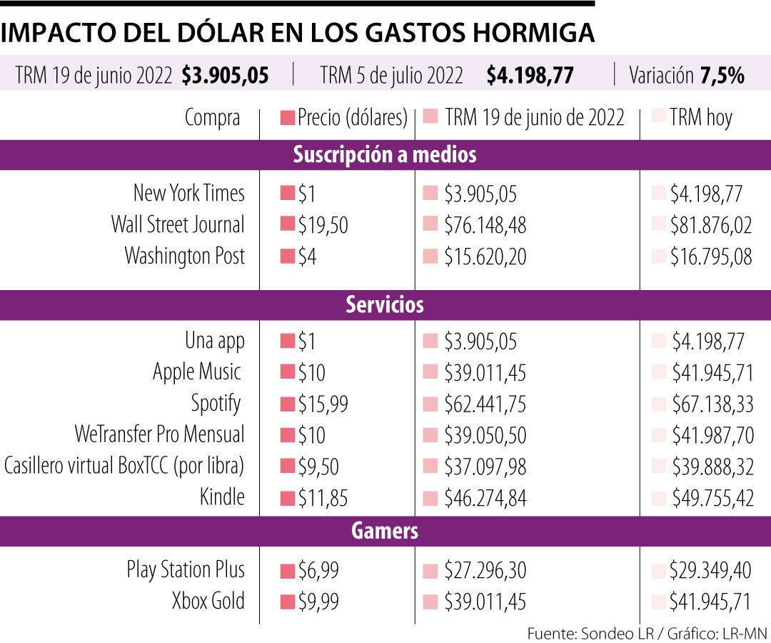 Entre los productos que los colombianos han visto aumentar su costo se encuentran la suscripción a The New York Times, la cual tiene un precio mensual de US$1; mientras que la membresía de The Wall Street Journal, que tiene un costo estándar de US$19,50 mensuales, pasó de representar $76.148 el 19 de junio a $81.876 actualmente.