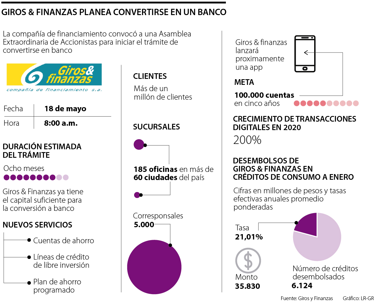 La compañía de financiamiento Giros & Finanzas convocó a una Asamblea Extraordinaria de Accionistas, que se realizará el próximo martes 18 de mayo. La reunión tiene el propósito de presentar, considerar y aprobar el proyecto de conversión a banco de la sociedad, con lo que sería la entidad número 28 del sistema local.
