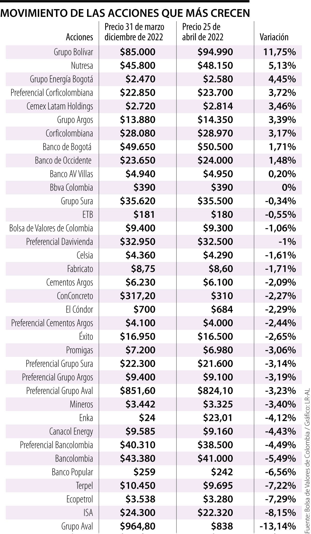 En este mismo periodo de tiempo, la acción que más ha crecido es la de Grupo Bolívar con un avance de 11,75%, pasando de $85.000 el 31 de marzo de 2022, a $94.990 durante la más reciente jornada de negociación. Dicho comportamiento se ha dado como corrección de la fuerte caída que se presentó a mediados de marzo luego de que la compañía cancelara su conversión de acciones ordinarias a preferenciales y desistiera de la recompra de acciones a $127.000 cada una.