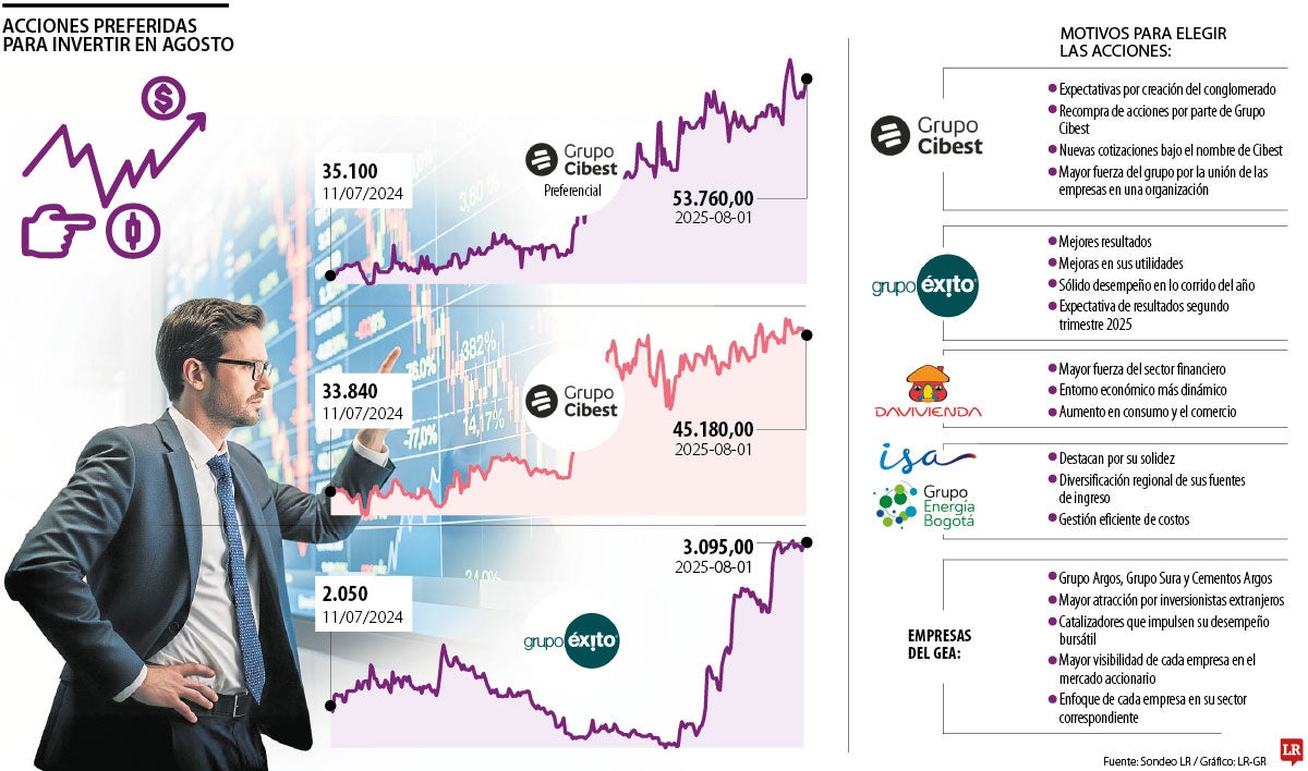 De acuerdo con los analistas consultados, las acciones preferidas para agosto son Grupo Éxito y las del Grupo Cibest como la ordinaria y la preferencial. Además, informaron que los sectores que destacarán son el financiero, consumo, las empresas que eran del GEA y algunas de energía.