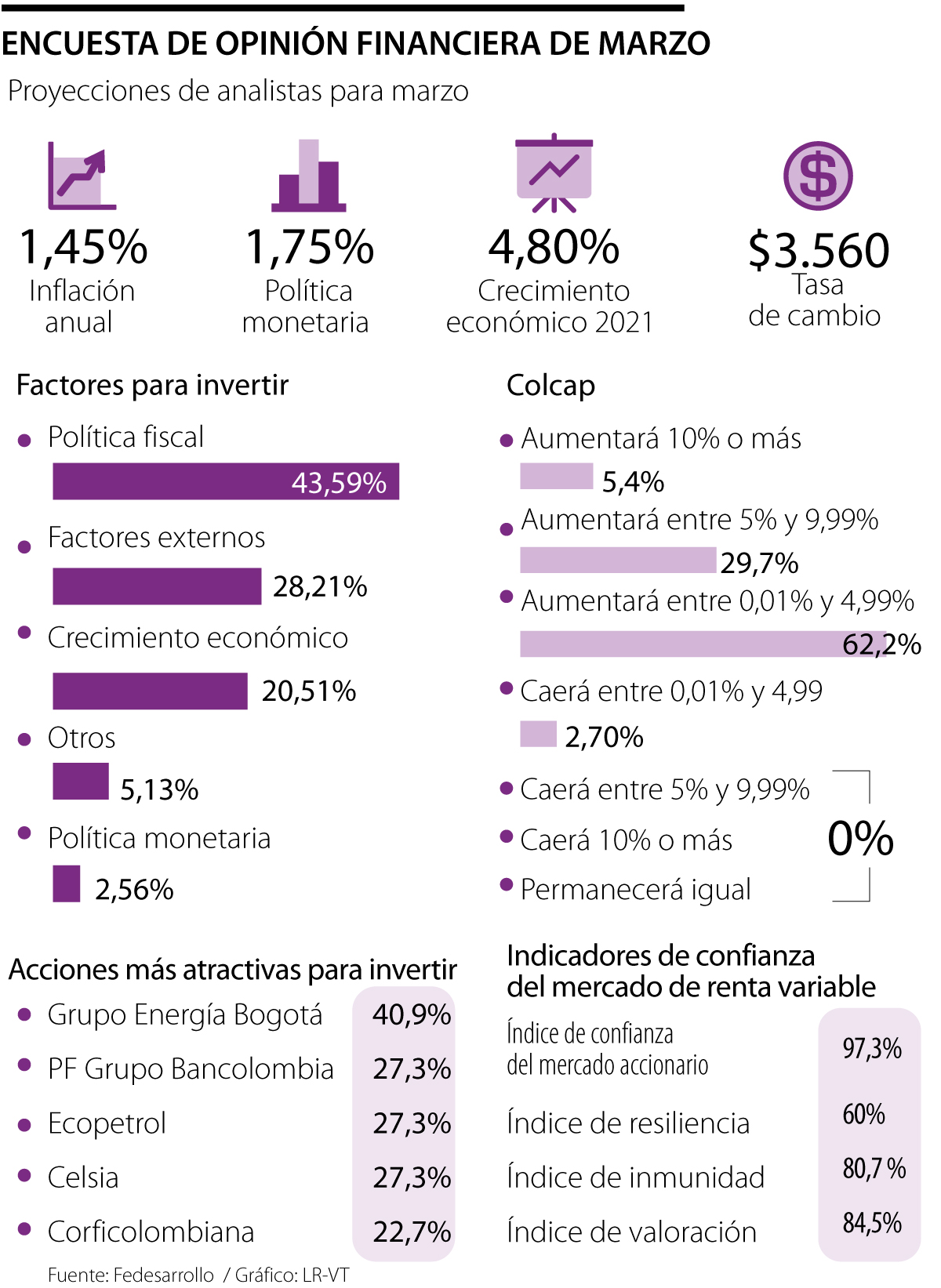 Fedesarrollo publicó los resultados de la Encuesta de Opinión Financiera (EOF) para marzo de 2021. Como es usual, la entidad reveló las acciones más atractivas para invertir. En marzo, el ranking lo lideró la acción del Grupo Energía Bogotá, con 40,9% de las respuestas de los analistas. Le siguieron la acción preferencial del Grupo Bancolombia (27,3%), la acción ordinaria de Ecopetrol (27,3%), la de Celsia (27,3%) y la de Corficolombiana (22,7%).